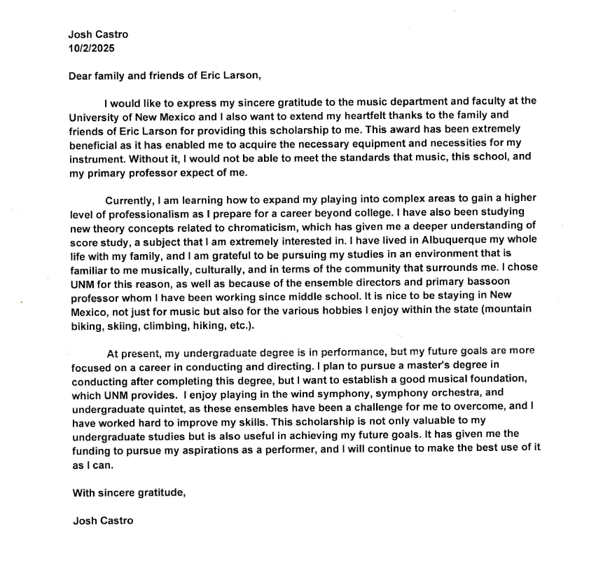 This year, The Eric Larson Endowment awarded a $2000.00 scholarship for the 2025-2026 school year to UNM student Josh Castro, a music major and bassoonist at the University of New Mexico. Josh is from Albuquerque and chose UNM to remain close to his family, but also because his professor at UNM has been instructing Josh since middle school. The scholarship monies provided allowed Josh to purchase a bassoon and accessories that met his academic requirements.